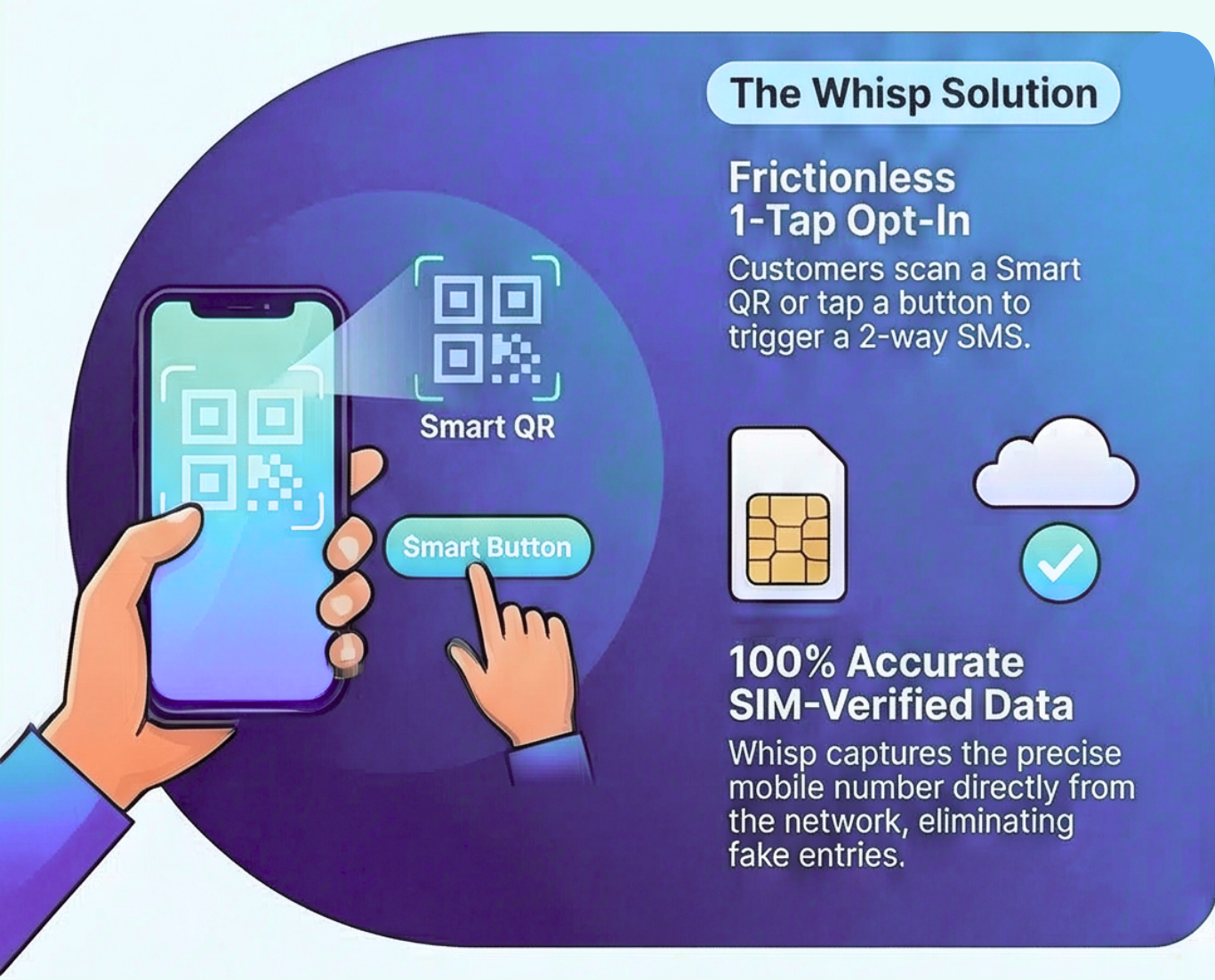 Whisp captures verified mobile consent at the moment of interaction, turning anonymous visitors into activated customers across SMS, RCS, and CRM platforms.